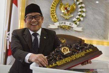 Wakil Ketua DPR Muhaimin Iskandar membereskan papan nama di ruang kerjanya, di Gedung Nusantara III, Kompleks Parlemen, Senayan, Jakarta, Senin (30/9/2024). Wakil Ketua DPR periode 2019-2024 itu berkemas di hari terakhir dirinya menjabat, jelang pelantikan anggota DPR terpilih periode 2024-2029 pada Selasa, 1 Oktober 2024. ANTARA FOTO/Indrianto Eko Suwarso/foc.