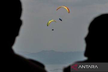 Pengunjung melihat dua peserta yang mengikuti West Java Paragliding Championship, melayang di atas Waduk Jatigede, Kabupaten Sumedang, Jawa Barat, Selasa, (1/10/2024). Kejuaraan Intenasional Paralayang yang diikuti 99 peserta dari 10 negara di Eropa dan Asia tersebut digelar untuk mengasah bakat potensial atlet tanah air sehingga dapat bersaing pada kompetisi internasional serta guna mendongkrak potensi wisatawan berkunjung ke Kabupaten Sumedang. ANTARA FOTO/Raisan Al Farisi/Spt.