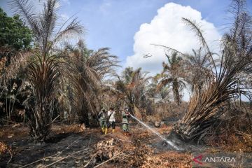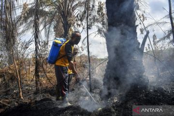 Petugas gabungan Manggala Agni Daops Lahat, TNI dan Polri melakukan pemadaman kebakaran hutan dan lahan (Karhutla) di Desa Gumai- Putak Kecamatan Gelumbang, Muara Enim, Sumatera Selatan, Selasa (1/10/2024). Kepala BNPB Letjen TNI Suharyanto memantau langsung pemadaman karhutla di daerah tersebut dan meminta Provinsi Sumatera Selatan agar tidak terus menerus menjadi primadona dalam kasus karhutla. ANTARA FOTO/Nova Wahyudi/aww.