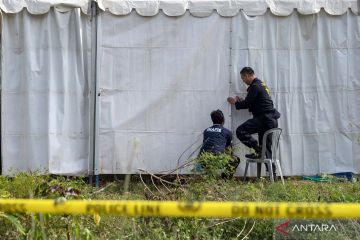 Petugas menutup tenda tempat dilakukannya autopsi saat ekshumasi atau pembongkaran makam almarhum Bayu Adhitiyawan, seorang tahanan Polresta Palu di pemakaman Kelurahan Duyu, Palu, Sulawesi Tengah, Jumat (4/10/2024). Polda Sulteng melakukan ekshumasi dengan mendatangkan dokter forensik independen untuk mengetahui penyebab pasti kematian tahanan tersebut yang oleh pihak keluarga almarhum diduga meninggal secara tak wajar. ANTARA FOTO/Basri Marzuki/aww.