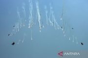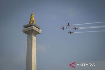 Pesawat KT-1 Wong Bee yang tergabung dalam Jupiter Aerobatic Team (JAT) TNI AU bermanuver saat perayaan HUT Ke-79 TNI di Lapangan Silang Monumen Nasional (Monas), Gambir, Jakarta, Sabtu (5/10/2024). Sebanyak 30.206 personel pasukan, 521 alutsista, dan 145 unit kendaraan klasik dan moge memeriahkan perayaan HUT Ke-79 TNI. ANTARA FOTO/Muhammad Ramdan/tom.