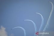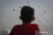 Seorang anak menyaksikan atraksi pesawat Beechcraft Bonanza G36 yang tergabung dalam tim demonstrasi udara Rajawali Laut Flight (RaLF) TNI AL dalam perayaan HUT ke-79 TNI di Lapangan Silang Monumen Nasional (Monas), Gambir, Jakarta, Sabtu (5/10/2024). Sebanyak 30.206 personel pasukan, 521 alutsista, dan 145 unit kendaraan klasik dan moge memeriahkan perayaan HUT Ke-79 TNI. ANTARA FOTO/Muhammad Ramdan/tom.