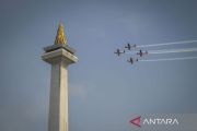 Pesawat tempur Sukhoi melakukan boomburst dan high speed pass pada peringatan HUT Ke-79 TNI di kawasan Monas, Jakarta, Sabtu (5/10/2024). Peringatan HUT Ke-79 TNI tersebut diisi dengan demo terjun free fall, parade alutsista TNI, serta aksi fly pass pesawat tempur. ANTARA FOTO/Indrianto Eko Suwarso/tom.