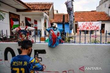 Siswa SDN Astanaanyar 249 melukis di tembok di kawasan permukiman Liogenteng, Bandung, Jawa Barat, Senin (7/10/2024). Solidaritas seni untuk Palestina bersama warga Liogenteng menggelar aksi bela Palestina dengan melukis tembok rumah di permukiman padat dalam rangka memperingati satu tahun agresi Israel ke Palestina. ANTARA FOTO/Raisan Al Farisi/YU