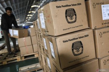 Petugas menata kardus berisi tinta Pilkada 2024 di gudang logistik KPU Kabupaten Tangerang, Tigaraksa, Kabupaten Tangerang, Banten, Selasa (8/10/2024). KPU Kabupaten Tangerang telah menerima 9.180 kotak suara, 17.066 bilik suara, 215.722 segel kertas, 53.736 segel tees dan 8.966 botol tinta untuk 4.484 TPS Pilkada 2024. ANTARA FOTO/Sulthony Hasanuddin/foc.