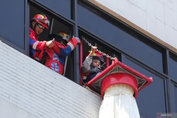 Petugas mengevakuasi korban menggunakan selubung luncur saat simulasi penanganan tanggap darurat bencana di Surabaya, Jawa Timur, Kamis (10/10/2024). Simulasi yang digelar Badan Penanggulangan Bencana Daerah Kota Surabaya dan melibatkan jajaran terkait lainnya tersebut dalam rangka Bulan Pengurangan Risiko Bencana (PRB) 2024 dan melatih kesiapan petugas dalam menghadapi bencana. ANTARA FOTO/Didik Suhartono/foc.