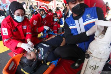 Sejumlah petugas Palang Merah Indonesia melakukan pertolongan pertama terhadap korban saat simulasi penanganan tanggap darurat bencana di Surabaya, Jawa Timur, Kamis (10/10/2024). Simulasi yang digelar Badan Penanggulangan Bencana Daerah Kota Surabaya dan melibatkan jajaran terkait lainnya tersebut dalam rangka Bulan Pengurangan Risiko Bencana (PRB) 2024 dan melatih kesiapan petugas dalam menghadapi bencana. ANTARA FOTO/Didik Suhartono/foc.