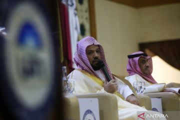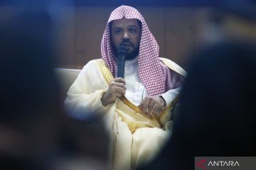 Imam Besar Masjid Nabawi Madinah Syekh Ahmad bin Ali Al-Hudzaifi menyampaikan paparan dalam kuliah umum di Kampus UIN Syarief Hidayatullah Jakarta, Ciputat, Tangerang Selatan, Banten, Kamis (10/10/2024). Dalam kuliah umum tersebut Imam Besar Masjid Nabawi mengupas isu-isu kontemporer dalam pendidikan Islam dan menekankan pentingnya menerapkan nilai-nilai Islam moderat dalam konteks global saat ini. ANTARA FOTO/Muhammad Iqbal/aww.