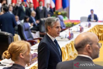 Menteri Luar Negeri AS Antony Blinken (tengah) berjalan menuju ruang pertemuan sebelum KTT Ke-12 ASEAN-US di National Convention Center, Vientiane, Laos, Jumat (11/10/2024). ANTARA FOTO/M Agung Rajasa/nym.
