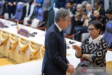 Menteri Luar Negeri Retno Marsudi (kanan) berbincang dengan Menteri Luar Negeri AS Antony Blinken (kiri) sebelum KTT Ke-12 ASEAN-US di National Convention Center, Vientiane, Laos, Jumat (11/10/2024). ANTARA FOTO/M Agung Rajasa/nym.