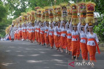 Umat Hindu menjunjung gebogan atau sesajen berisi kue, buah, bunga, dan hiasan janur saat tradisi Mapeed di objek wisata Alas Kedaton, Desa Kukuh, Tabanan, Bali, Rabu (16/10/2024). Tradisi yang digelar pada 16-18 Oktober 2024 tersebut diikuti ratusan perempuan Bali dalam rangkaian upacara persembahyangan di Pura Dalem Kahyangan Kedaton sekaligus untuk meningkatkan kunjungan wisatawan ke objek wisata itu. ANTARA FOTO/Nyoman Hendra Wibowo/tom.