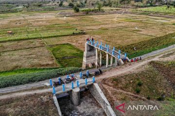 Foto udara sejumlah warga duduk di tepi Waduk Perning yang mengering di Nganjuk, Jawa Timur, Rabu (16/10/2024). Sejak lima bulan terakhir, waduk yang berfungsi untuk perikanan, wisata, dan irigasi bagi sekitar 200 hektare lahan pertanian itu mengering akibat kemarau. ANTARA FOTO/Muhammad Mada/tom.
