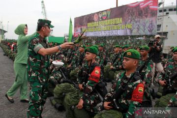 Pangdam I/Bukit Barisan Mayjen TNI Mochammad Hasan (kedua kiri) didampingi Ketua Persit Kartika Chandra Kirana Anggi Mochammad Hasan (kiri) menaburkan tepung tawar kepada prajurit saat upacara penyambutan purnatugas Satgas Pamtas RI-PNG di Dermanga 103 Belawan, Medan, Sumatera Utara, Jumat (18/10/2024). Sebanyak 450 prajurit Yonif 122/TS Kodam I/Bukit Barisan tiba di Medan menggunakan KRI Teluk Calang-524 usai bertugas dalam pengamanan di perbatasan RI-PNG di Papua selama 18 bulan. ANTARA FOTO/Yudi Manar/aww.