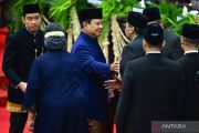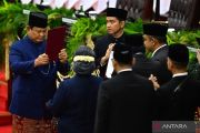 Presiden Prabowo Subianto (kanan) dan Wakil Presiden Gibran Rakabuming Raka (kiri) menjabat tangan jajaran pimpinan MPR usai mengucapkan sumpah jabatan dalam sidang paripurna MPR di Gedung Nusantara, Kompleks Parlemen, Senayan, Jakarta, Minggu (20/10/2024). Prabowo Subianto dan Gibran Rakabuming Raka dilantik sebagai Presiden dan Wakil Presiden Republik Indonesia masa bakti 2024-2029. ANTARA FOTO/Rivan Awal Lingga/aww.