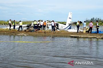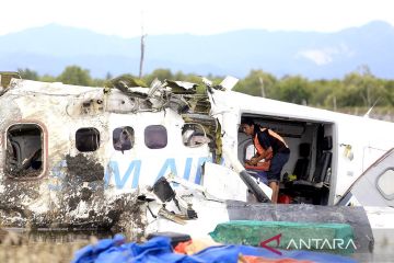 Petugas Komite Nasional Keselamatan Transportasi (KNKT) memeriksa bangkai pesawat SAM Air yang jatuh di sekitar Bandara Panua di Kabupaten Pohuwato, Gorontalo, Senin (21/10/2024). KNKT melakukan investigasi awal kecelakaan pesawat perintis milik PT. SAM Air dengan nomor registrasi PK-SMH (DHC6) yang jatuh sekitar 300 meter dari landasan pacu bandara pada Minggu (20/11), dan menyebabkan empat orang meninggal dunia. ANTARA FOTO/Adiwinata Solihin/Spt.