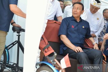 Penasihat Khusus Presiden bidang Politik dan Keamanan Wiranto menaiki becak listrik saat peresmian Kantor Persatuan Becak Listrik Indonesia (PBLI) di Denpasar, Bali, Selasa (29/10/2024). Kantor tersebut diresmikan untuk mendukung program becak listrik sebagai sarana transportasi ramah lingkungan dan berkelanjutan di Indonesia sekaligus dapat menjadi atraksi pariwisata di Pulau Dewata. ANTARA FOTO/Fikri Yusuf/nym.