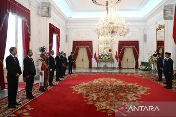 Presiden Prabowo Subianto (kanan) menerima para duta besar luar biasa dan berkuasa penuh (LBBP) di Istana Merdeka, Jakarta, Senin (4/11/2024). Presiden Prabowo menerima surat kepercayaan dari tujuh duta besar luar biasa dan berkuasa penuh negara-negara sahabat. ANTARA FOTO/Sigid Kurniawan/Spt.