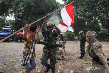 Sejumlah anggota Komunitas Onthel menampilkan Teatrikal Pembebasan Pejuang di Taman Makam Pahlawan Taruna Daan Mogot, Kota Tangerang, Banten, Minggu (10/11/2024). Teatrikal tentang pembebasan pejuang Indonesia yang ditahan tentara Jepang tersebut dalam ranngka memperingati Hari Pahlawan Nasional. ANTARA FOTO/Sulthony Hasanuddin/wpa.
