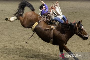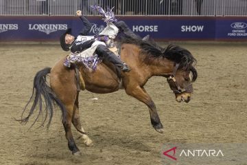 Aksi koboi Trevor Van Alstine saat mengikuti kompetisi Bareback Bronc Riding pada Royal Horse Show 2024 di Royal Rodeo, Toronto, Kanada (10/11/2024. ANTARA FOTO/Xinhua/Zou Zheng/tom.