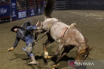 Aksi koboi Spencer Parker saat mengikuti kompetisi Bareback Bronc Riding pada Royal Horse Show 2024 di Royal Rodeo, Toronto, Kanada (10/11/2024. ANTARA FOTO/Xinhua/Zou Zheng/tom.