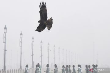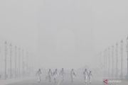 Sejumlah anak sekolah berlarian di Kartavya Path dalam kabut polusi udara yang menyelimuti kota New Delhi, India, Rabu (13/11/2024). Polusi udara di kota itu disebutkan telah mencapai level 'severe' atau 'very poor' yang mengakibatkan jarak pandang menjadi terbatas. ANTARA FOTO/Shrikant Singh via Reuters Conne/ANI/foc.