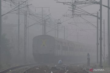 Warga menunggu kereta di jalur kereta dalam kabut polusi udara yang menyelimuti kota New Delhi, India, Rabu (13/11/2024). Polusi udara di kota itu disebutkan telah mencapai level 'severe' atau 'very poor' yang mengakibatkan jarak pandang menjadi terbatas. ANTARA FOTO/REUTERS/Anushree Fadnavis/foc.
