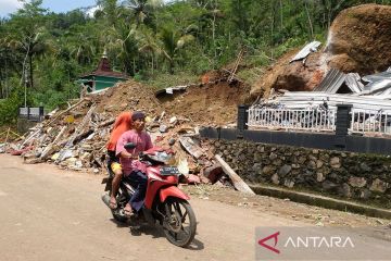 Warga melintas di dekat lokasi bencana tanah longsor di Desa Plipiran Bruno, Purworejo, Jawa Tengah, Rabu (20/11/2024). Longsor yang terjadi akibat hujan deras tersebut mengakibatkan empat warga tewas dan puluhan sepeda motor tertimbun material longsoran. ANTARA FOTO/Anis Efizudin/Spt.