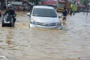 Pengendara motor dan mobil berusaha melintasi banjir di Dayeuhkolot, Kabupaten Bandung, Jawa Barat, Jumat (22/11/2024). BPBD Kabupaten Bandung mencatat sebanyak dua kecamatan di Kabupaten Bandung terdampak banjir setinggi 30cm hingga 110cm akibat meluapnya Sungai Citarum. ANTARA FOTO/Novrian Arbi/foc.