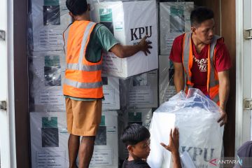 Pekerja memasukkan logistik Pilkada ke dalam mobil boks di gudang logistik KPU Makassar, Sulawesi Selatan, Sabtu (23/11/2024). KPU Kota Makassar mulai mendistribusikan logistik Pilkada 2024 secara bertahap ke seluruh kecamatan di daerah itu yang selanjutnya akan disebar ke 1.877 TPS pada H-1 tempat pemungutan suara (TPS). ANTARA FOTO/Arnas Padda/foc.
