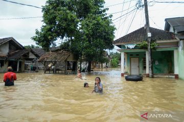 Sejumlah anak bermain air saat banjir di Desa Idaman, Pandeglang, Banten, Kamis (5/12/2024). Sebanyak 430 rumah yang berada di empat kampung di Desa Idaman tersebut terisolir akibat banjir dari luapan sungai Cilemer setinggi 1-2,5 meter sejak Senin (2/12) dan warga memilih tetap bertahan di rumahnya masing-masing. ANTARA FOTO/Muhammad Bagus Khoirunas/aww.