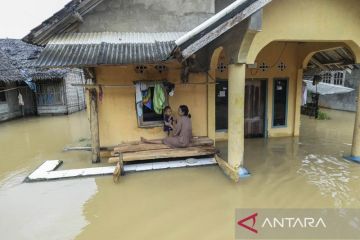 Warga berada di depan rumahnya yang terendam banjir di Desa Idaman, Pandeglang, Banten, Kamis (5/12/2024). Sebanyak 430 rumah yang berada di empat kampung di Desa Idaman tersebut terisolir akibat banjir dari luapan sungai Cilemer setinggi 1-2,5 meter sejak Senin (2/12) dan warga memilih tetap bertahan di rumahnya masing-masing. ANTARA FOTO/Muhammad Bagus Khoirunas/aww.