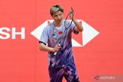 Pebulu tangkis China Shi Yuqi mengekspresikan kegembiraanya seusai memenangi pertandingan tunggal putra Grup B BWF World Tour Finals 2024 melawan pebulu tangkis Indonesia Jonatan Christie di Hangzhou, China, Rabu (11/12/2024). Shi Yuqi mengalahkan Jonatan Christie dengan tiga gim 21-16, 17-21, dam 21-8. ANTARA FOTO/Xinhua/Hou Zhaokang/aww.