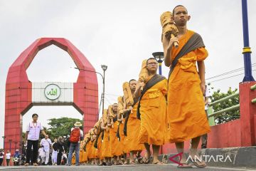 Sejumlah Biksu Thudong disambut sejumlah warga pada rangkaian Pabbajja Samanera di Kota Tangerang, Banten, Minggu (29/12/2024). Sejumlah Biksu Thudong bersama peserta Samanera berjalan dari Perguruan Budhi Dharma Tangerang menuju Vihara Boen Tek Bio untuk melakukan prosesi Pindapata yaitu tradisi umat Buddha yang melibatkan bhikkhu berjalan kaki sambil membawa mangkuk untuk menerima sedekah dari umat. ANTARA FOTO/Sulthony Hasanuddin/Spt.