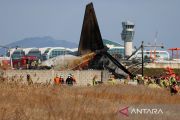 Petugas melakukan operasi penyelamatan setelah pesawat Jeju Air mengalami kecelakaan di luar landasan pacu Bandara Internasional Muan, Muan, Korea Selatan, Minggu (29/12/2024). Menurut otoritas setempat kecelakaan yang menimbulkan kobaran api itu diduga kegagalan pada roda pendaratan akibat tabrakan dengan burung sehingga menyebabkan sedikitnya 28 penumpang tewas. ANTARA FOTO/ REUTERS/Kim Hong-Ji/Spt.