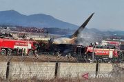 Petugas pemadam kebakaran berada di sekitar pesawat Jeju Air yang keluar dari landasan pacu di Bandara Internasional Muan, Muan, Provinsi Jeolla Selatan, Korea Selatan, Minggu (29/12/2024). Menurut otoritas setempat kecelakaan yang menimbulkan kobaran api itu diduga kegagalan pada roda pendaratan akibat tabrakan dengan burung sehingga menyebabkan sedikitnya 28 penumpang tewas. ANTARA FOTO/ REUTERS/YONHAP/Spt.