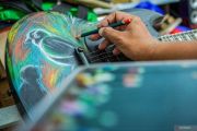 Seniman menyelesaikan proses lukis gitar di Lumajang, Jawa Timur, Sabtu (4/1/2025). Seniman yang menekuni jasa lukis gitar sejak 2019 dengan biaya sekitar Rp10 juta - Rp12 juta per buah tersebut memanfaatkan media sosial untuk memasarkan jasanya dan telah melukis gitar milik sejumlah musisi dan gitaris Indonesia. ANTARA FOTO/Irfan Sumanjaya/foc.