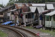 Warga berjalan di area permukiman pinggir rel kereta api di Kota Serang, Banten, Kamis (16/1/2025). Berdasarkan data Badan Pusat Statistik (BPS) Banten, jumlah penduduk miskin di Banten pada September 2024 sebanyak 777,49 ribu orang atau turun 14,12 ribu orang dibandingkan Maret 2024 dan turun 48,64 ribu orang dibandingkan Maret 2023. ANTARA FOTO/Angga Budhiyanto/rwa.