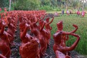 Wisatawan melintas di antara patung saat mengunjungi wahana seribu patung penari gandrung di Taman Gandrung Terakota, Banyuwangi, Jawa Timur, Kamis (23/1/2025). Ribuan patung seperti patung penari gandrung, unggas dan catur bertema kerajaan yang dibangun di kaki Gunung Ijen tersebut selain untuk daya tarik wisatawan juga sebagai upaya merawat identitas budaya Banyuwangi. ANTARA FOTO/Budi Candra Setya/foc.