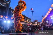 Warga menyaksikan penampilan barongsai di kawasan Pantjoran Pantai Indah Kapuk (PIK), Jakarta Utara, Sabtu (25/1/2025). Pengelola Pantjoran PIK menghadirkan pertunjukan barongsai, lomba menyanyi lagu mandarin, berfoto dengan kostum kekaisaran China dan tarian dalam rangka menyambut tahun baru Imlek 2576 kongzili. ANTARA FOTO/Fakhri Hermansyah/rwa.