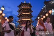 Sejumlah pengunjung berjalan dengan latar belakang pagoda di kawasan Pantjoran Pantai Indah Kapuk (PIK), Jakarta Utara, Sabtu (25/1/2025). Pengelola Pantjoran PIK menghadirkan pertunjukan barongsai, lomba menyanyi lagu mandarin, berfoto dengan kostum kekaisaran China dan tarian dalam rangka menyambut tahun baru Imlek 2576 kongzili. ANTARA FOTO/Fakhri Hermansyah/rwa.