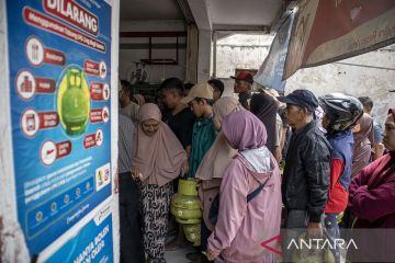 Warga antre membeli gas elpiji 3 kilogram bersubsidi di salah satu pangkalan gas elpiji di Kota Cimahi, Jawa Barat, Senin (3/2/2025). Warga Kota Cimahi dalam tiga hari terakhir kesulitan mendapatkan gas elpiji 3 kilogram bersubsidi disebabkan keterbatasan stok di tingkat pengecer serta adanya kebijakan pemerintah yang menetapkan pembelian gas elpiji 3 kilogram sepenuhnya hanya dilayani di pangkalan atau penyalur resmi Pertamina. ANTARA FOTO/Abdan Syakura/rwa.