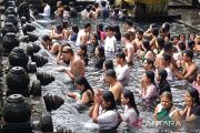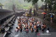 Umat Hindu berbaur dengan wisatawan mancanegara saat mengikuti ritual melukat atau pembersihan diri pada hari Banyu Pinaruh di Pura Tirta Empul, Tampaksiring, Gianyar, Bali, Minggu (9/2/2025). Umat Hindu di Bali tetap menjalani ritual yang digelar setiap enam bulan sekali yakni sehari setelah Hari Raya Saraswati tersebut meski hujan deras mengguyur kawasan itu. ANTARA FOTO/Nyoman Hendra Wibowo/rwa.