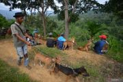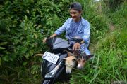 Warga membawa anjingnya menggunakan motor menaiki perbukitan saat mengikuti ajang buru babi di Nagari Tanjung Barulak, Tanah Datar, Sumatera Barat, Minggu (16/2/2025). Tradisi berburu babi itu dilakukan dua kali dalam seminggu untuk membantu petani memberantas hama babi hutan yang merusak tanaman dan perkebunan sekaligus rekreasi dan olahraga para pehobi berburu. ANTARA FOTO/Iggoy el Fitra/foc.