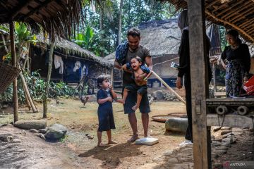 Seorang bapak Suku Badui membujuk anaknya untuk ditimbang sebelum diberikan vitamin A di Kampung Cisadane, Lebak, Banten, Minggu (16/2/2025). Pemberian vitamin A dengan menyasar sebanyak 119 anak balita Suku Badui usia 6-59 bulan di empat perkampungan di pedalaman Badui tersebut dilakukan guna memenuhi kebutuhan gizi anak sekaligus menangani permasalahan kesehatan mata, dan memberikan kekebalan imun tubuh bagi anak pedalaman. ANTARA FOTO/Muhammad Bagus Khoirunas/foc.