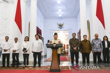 Presiden Prabowo Subianto (tengah) didampingi Menko Perekonomian Airlangga Hartarto (keempat kiri), Ketua DEN Luhut Binsar Pandjaitan (keempat kanan), Menkeu Sri Mulyani Indrawati (ketiga kiri), Menteri BUMN Erick Thohir (ketiga kanan), Menteri ESDM Bahlil Lahadalia (kedua kiri), Menteri Investasi dan Hilirisasi Rosan Roeslani (kedua kanan), Mensesneg Prasetyo Hadi (kiri), dan Menkomdigi Meutya Hafid (kanan) mengumumkan peraturan pemerintah terkait devisa hasil ekspor sumber daya alam di Istana Merdeka, Jakarta, Senin (17/2/2025). Presiden menerbitkan Peraturan Pemerintah (PP) Nomor 8 Tahun 2025 yang mewajibkan seluruh eksportir menyimpan dana DHE SDA di bank dalam negeri untuk memperkuat dan memperbesar dampak dari perolehan devisa. ANTARA FOTO/Hafidz Mubarak A/Spt.