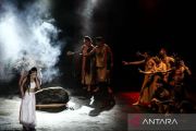 Sejumlah seniman menampilkan sendratari legenda Batu Bawui di UPT Taman Budaya, Palangka Raya, Kalimantan Tengah, Rabu (26/2/2025). Pertunjukan sendratari yang menceritakan legenda Batu Bawui dari Desa Tumbang Miwan, Kabupaten Gunung Mas tersebut mengisahkan percintaan seorang laki-laki dengan sosok perempuan yang berbeda alam. ANTARA FOTO/Auliya Rahman/tom.