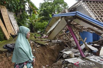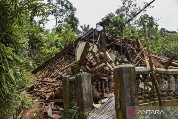 Suasana rumah yang ambruk akibat pergerakan tanah di Desa Cikondang, Kabupaten Tasikmalaya, Jawa Barat, Rabu (5/3/2025). BPBD Kabupaten Tasikmalaya mencatat bencana pergerakan tanah yang melanda di Kecamatan Cineam, Kabupaten Tasikmalaya itu semakin meluas dan mengakibatkan 91 rumah tidak bisa ditempati atau roboh dan lahan terdampak seluas 8-10 hektare. ANTARA FOTO/Adeng Bustomi/YU