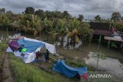 Sejumlah warga yang rumahnya masih terendam banjir beristirahat di tenda pengungsian darurat bantuan BBD Grobogan di area lereng tanggul Sungai Tuntang di Dusun Mintreng, Desa Baturagung, Kecamatan Gubug, Kabupaten Grobogan, Jawa Tengah, Rabu (12/3/2025). Menurut warga korban banjir, pada hari keempat banjir yang merendam desa yang berlokasi di samping tanggul Sungai Tuntang yang jebol itu berangsur surut dari ketinggian bervariasi sekitar 50 cm - 2 meter pada Minggu (9/3) lalu menjadi sekitar 10-80 cm per Rabu (12/3) pukul 17:00 WIB, menyusul sudah mulai tertutupnya tanggul yang jebol tersebut oleh Balai Besar Wilayah Sungai Pemali-Juana. ANTARA FOTO/Aji Styawan/rwa.