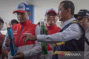 Menteri ESDM Bahlil Lahadalia (kiri) didampingi Komisaris Utama PT Pertamina (Persero) Mochamad Iriawan (kedua kiri) menyaksikan petugas Lemigas menguji sampel kualitas produk BBM jenis pertamax dan pertalite saat meninjau kesiapan SPBU dalam melayani arus mudik lebaran di Rest Area KM 379A Tol Semarang-Batang, di Kabupaten Batang, Jawa Tengah, Kamis (20/3/2025). PT Pertamina (Persero) memastikan kesiapan sejumlah titik rest area di jalur Tol Trans Jawa dalam melayani kebutuhan BBM pemudik serta menyediakan tempat beristirahat khusus dan gratis selama arus mudik Lebaran 2025 agar nyaman dan lancar. ANTARA FOTO/Aji Styawan/Spt.