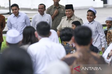 Presiden Prabowo Subianto (kedua kanan) berjalan bersama anak-anak saat pengumuman pengesahan Peraturan Pemerintah (PP) tentang Tata Kelola Penyelenggaraan Sistem Elektronik dalam Perlindungan Anak di halaman Istana Merdeka, Jakarta, Jumat (28/3/2025). PP tersebut di antaranya mengatur pembatasan penggunaan media sosial dan pembatasan akses konten-konten digital untuk anak. ANTARA FOTO/Hafidz Mubarak A/wpa.